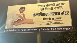 बीजेपी नेता तेजिंदर पाल सिंह बग्गा ने पोस्टर लगवा कर दिल्ली सीएम अरविंद केजरीवाल को घेरा है। बग्गा ने केजरीवाल मसाज सेंटर वाले पोस्टर लगाए हैं। इन पोस्टरों में केजरीवाल की एडिट करके मसाज करते हुए फोटो लगाई गई है। साथ ही पोस्टर पर लिखा है, “तिहाड़ जेल की तर्ज पर पूरी दिल्ली में बनेंगे केजरीवाल मसाज सेंटर” साथ ही पोस्टर में लिखा है, “दिल्ली सरकार पाप की सरकार।”