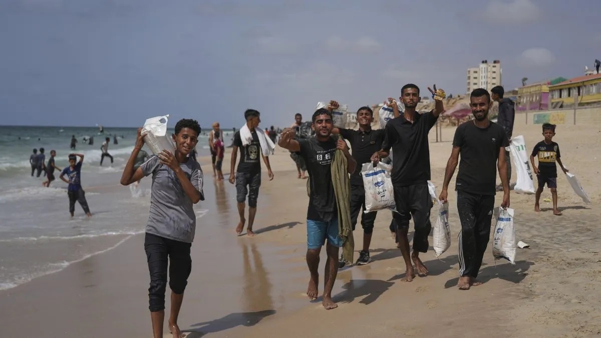 ऊपर से गिराये खाद्य पैकेट ले जाते गाजा के नागरिक।