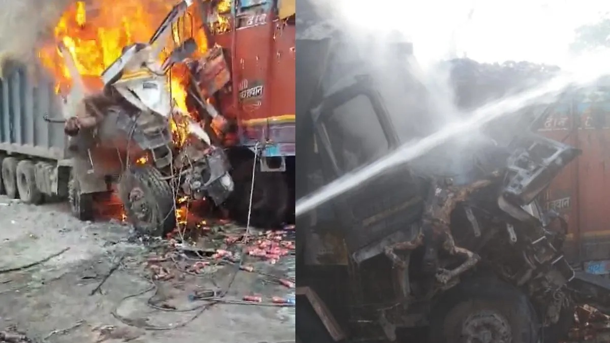 यूपी में सोनभद्र के हाथीनाला में वाराणसी-शक्तिनगर मार्ग पर हथवानी गांव के पास दो ट्रकों की आमने-सामने टक्कर हो गई। इसकी वजह से भीषण आग लगने से बड़ा हादसा हो गया है। शनिवार शाम करीब 5 बजे हुई इस घटना में 2 लोगों की जिंदा जलकर मौत हो गई, जबकि एक व्यक्ति को गंभीर हालत में बाहर निकालकर हिंडाल्को अस्पताल में भर्ती कराया गया है। उसका इलाज अस्पताल में चल रहा है।टक्कर इतनी तेज थी कि दोनों ट्रकों में तुरंत आग लग गई और आग ने देखते ही देखते विकराल रूप ले लिया। इस हादसे के समय चालक और खलासी ट्रकों में ही फंस गए, जिससे स्थिति और भयावह हो गई। वीडियो में धू-धू कर जलता हुआ ट्रक दिखाई दे रहा है। इसी आग में दोनों की मौत हो गई।पुलिस अधीक्षक अभिषेक वर्मा, सीओ पिपरी हर्ष पांडे और सीओ ओबरा अमित कुमार समेत कई थानों की पुलिस मौके पर पहुंच गई। आग बुझाने के लिए अल्ट्राटेक सीमेंट, चोपन फायर स्टेशन और हिंडाल्को की दमकल गाड़ियों को लगाया गया, जिन्होंने कड़ी मशक्कत के बाद आग पर काबू पाया। वीडियो में देखा जा सकता है कि टक्कर के बाद दोनों ट्रकों के आगे का हिस्सा पूरी तरह पिचक गया।एक ट्रक में राख और दूसरे में दूध के पैकेट लदे थे, जो हादसे के बाद सड़क पर बिखर गए। घटना के चलते हाईवे पर लंबा जाम लग गया, जिसे नियंत्रित करने के लिए यातायात को डायवर्ट किया गया। वहीं, मृतकों की पहचान अभी नहीं हो सकी है और पुलिस पूरे मामले की जांच में जुटी हुई है। मृतकों की पहचान का पता लगाया जा रहा है।